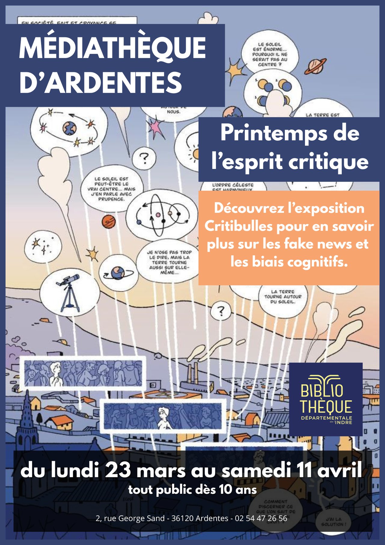 Dans le cadre du Printemps de l'Esprit Critique, évènement national qui a lieu du 19 mars au 5 avril, la médiathèque vous propose l'exposition "Critibulles" pour en savoir plus sur les fake news et les biais cognitifs.